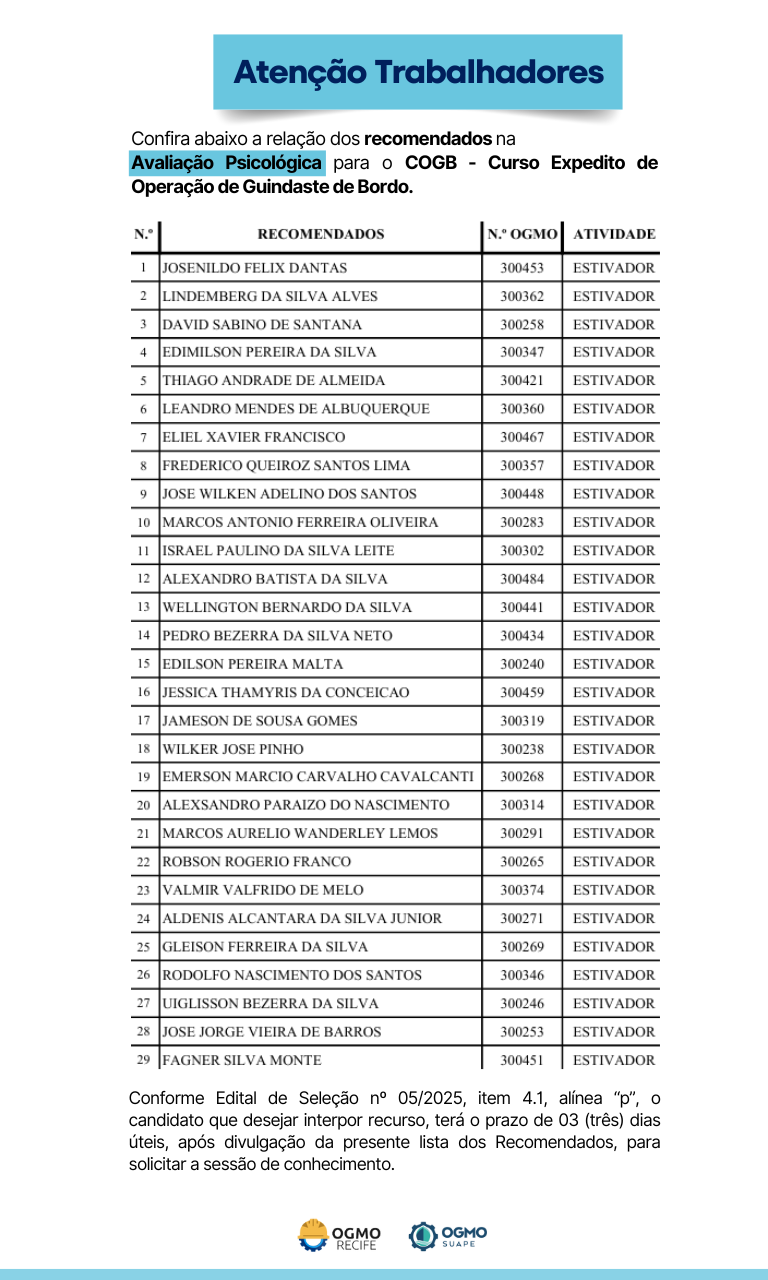 Curso COGB - Lista de recomendados na avaliação psicológica